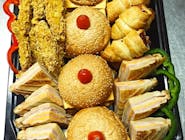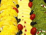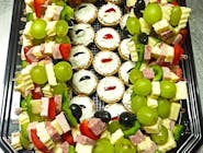 Crispy de pui, crispy de porc, chifteluțe, rulouri de șuncă, cașcaval, telemea, biluțe de brânză cu cașcaval, biluțe de brânză cu mac, biluțe de brânză cu verdeață, ardei roșu, galben, verde, roșii cherry, portocală, măsline, roșie coadă de rândunică